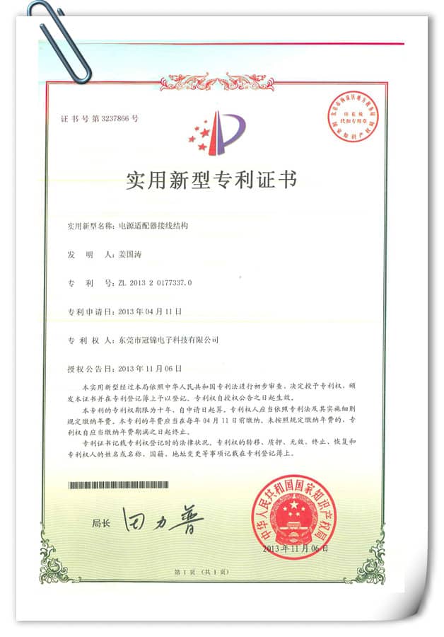 [返回]實(shí)用新型專利—電源適配器接線結(jié)構(gòu)(七)